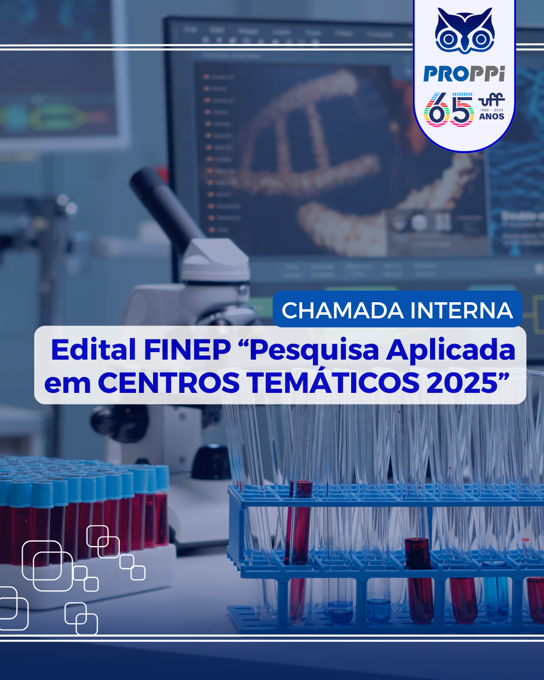 A Universidade Federal Fluminense, por meio de sua Pró-Reitoria de Pesquisa, Pós-Graduação e Inovação, informa a abertura de seleção interna para compor a Proposta Institucional no âmbito da CHAMADA PÚBLICA MCTI/FINEP/FNDCT Pesquisa Aplicada em CENTROS TEMÁTICOS 2025.